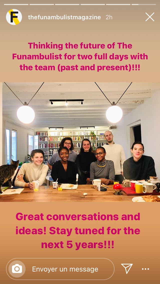 Ayant rejoint l’équipe pour la coordination de la publication The Funambulist by its Readers, j’ai par la suite été conviée par Léopold Lambert, rédacteur en chef et fondateur du Funambulist, à participer à une réflexion sur le futur du magazine et de ses différents formats.